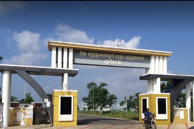 The Government Medical College, Pudukottai, is a Government College established in the Year 2017. The Medical college is affiliated to The Tamilnadu Dr. MGR Medical University, Chennai and recognized by National Medical Commission (NMC) and has an annual intake of 150 seats in MBBS. It is the first college in Tamil Nadu to admit 150 students in its first year of its inauguration in 2017, and is the 22nd government medical college and hospital in the state of Tamil Nadu. Being the only medical college of this district it caters to patients from four districts namely Pudukkottai, Thanjavur, Trichy & Sivaganga districts. It is well-connected by air, road and rail to all major cities like Trichy, Thanjavur and Madurai. The nearest airport is at Trichy (45kms).