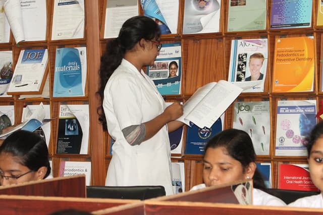 The library spread in an area of 9150sqft offers a user friendly air-conditioned environment with a fully computerized open access system. The library has an excellent collection of over 4060 Volumes and 922 Titles. The Resources subscribed by the library are a range of National and International Journals, Magazines, Periodicals, Newspapers etc. The Library subscribes the most popular Online Resource especially for Dentistry EBSCO Database-Dentistry & Oral Science Source(DOSS) which covers variety of National /International Journals and books from reputed publishers. State of art preclinical labs equipped with patient simulations and Wi Fi enabled campus. There is a Dental education museum within the campus. The campus houses well ventilated spacious hostels for girls and boys separately.
